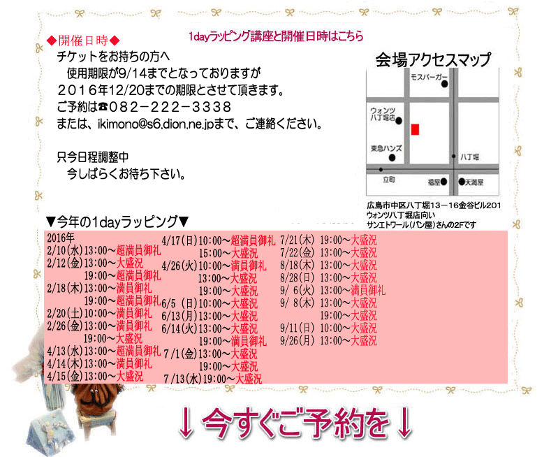 先着順にお席をご用意しますのでご予約はお急ぎ下さい!! ☎082-222-3338
